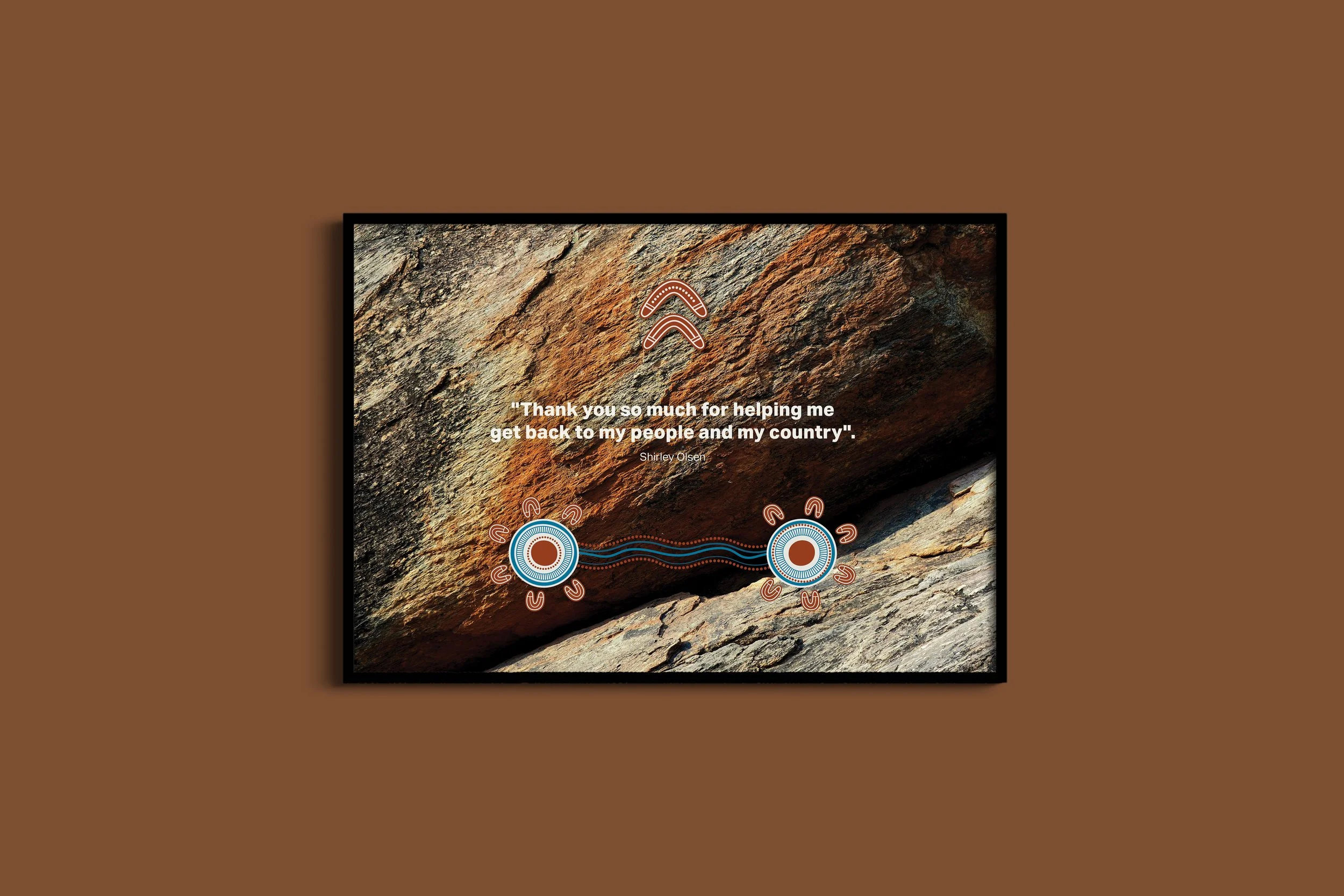 The elements and imagery were carefully chosen to reflect the essence of country. The boomerang symbols symbolise the concept of returning to country, just like a boomerang can return when thrown. The symbols at the bottom of the type/quote represent people coming together and travelling from one location (country) to another. The intention was to capture the deep connection and the emotions experienced when being on country. Additionally, I have chosen rock imagery, which is also symbolic of country.