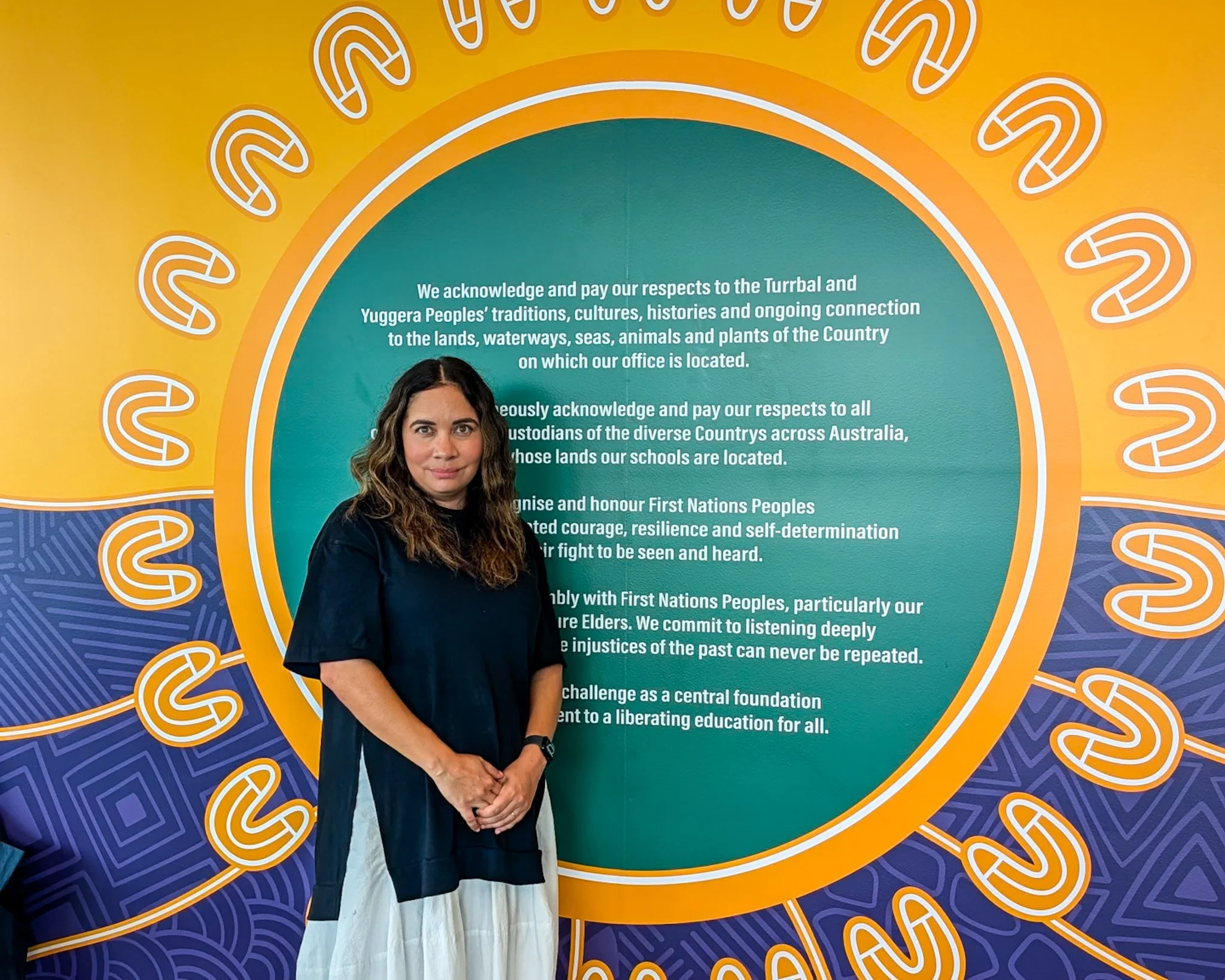 This Acknowledgment of Country art piece design for Edmund Rice Education Australia Flexible Schools Ltd reflects the school’s principles. Through intricate patterns representing honesty, participation, respect, safety, and legality, along with the touchstones of Inclusive Community, Gospel Spirituality, Justice and Solidarity, and Liberating Education, the design captures the essence of the schools’ values.