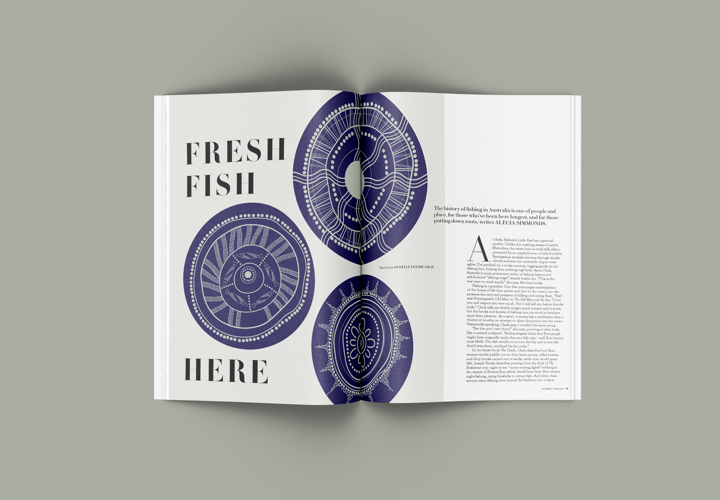 Fishing in Australia has a rich history, associated with people, place, and their connection to the land and water. This artwork was designed to accompany an article discussing the evolution of fishing in Australia, highlighting its cultural significance. The concentric circles in the artwork represent different locations discussed in the article that reflect the theme of fishing. Overall, the artwork aimed to symbolise the vastness of Australia's fishing history, depicting the different regions and their unique contributions to our country's cultural and economic legacy.
